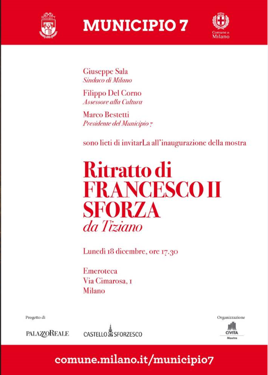 INVITO INAUGURAZIONE MOSTRA “RITRATTO DI FRANCESCO II SFORZA DA TIZIANO” LUNEDI’ 18 DICEMBRE ORE 17.30 EMEROTECA VIA CIMAROSA, 1 MILANO