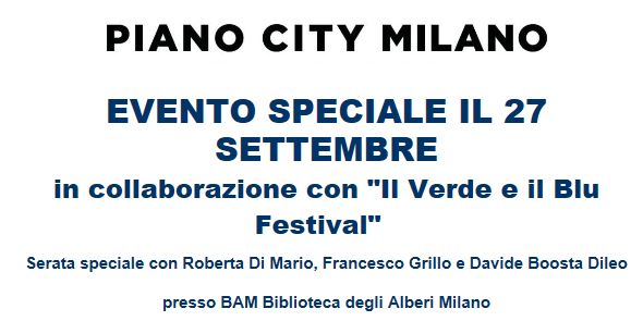 Sono aperte le prenotazioni per il concerto di domenica 27 settembre! In attesa di festeggiare il suo decimo compleanno, che si terrà a maggio 2021, Piano City Milano ti invita, domenica 27 settembre, a una speciale serata all’insegna della musica e della sostenibilità in collaborazione con “Il Verde e il Blu Festival – Buone idee per il futuro del pianeta”, una tre giorni di eventi (dal 25 al 27 settembre) per raccontare le migliori idee per il futuro del nostro pianeta, un futuro green, sostenibile e digitale. In qualità di content partner, Piano City Milano sarà presente alla Biblioteca degli Alberi, in occasione del gran finale dell’edizione 2020 de “Il Verde e il Blu Festival”, con tre speciali concerti di pianoforte. I protagonisti della serata saranno: Roberta Di Mario, Francesco Grillo e Davide Boosta Dileo. L’ingresso è gratuito con prenotazione obbligatoria, prenota QUI il tuo posto! Ingresso unico alle ore 19:00 presso BAM Biblioteca degli Alberi Milano. Tutti gli eventi de “Il Verde e Blu Festival” sono a ingresso gratuito con prenotazione obbligatoria tramite il sito web ufficiale. Sarà comunque possibile seguire tutti gli appuntamenti in streaming sul sito del festival. Per maggiori dettagli e informazioni su “Il Verde e il Blu Festival”: sito www.verdeblufestival.it e-mail segreteria@verdeblufestival.it telefono +39 02 2049838